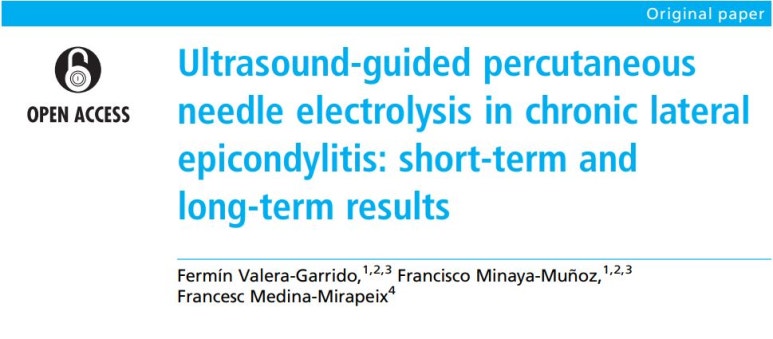 {Fermín Valera-Garrido, et al. Acupuncture in Medicine. 2014. Ultrasound-guided percutaneous needle electrolysis in chronic lateral epiconlylitis: short-term and long-term results}