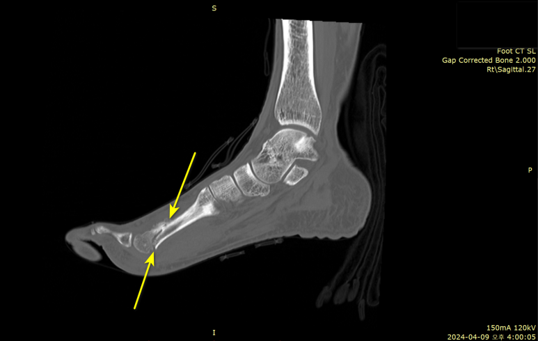 CT 정밀검사상두번째 중족골 골절로최종 진단되었습니다.