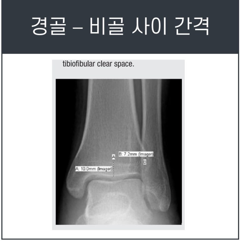 Ankle AP/Mortise view에서 경비관절의 연골성 부위인 clear space는 4-6mm가 정상입니다.