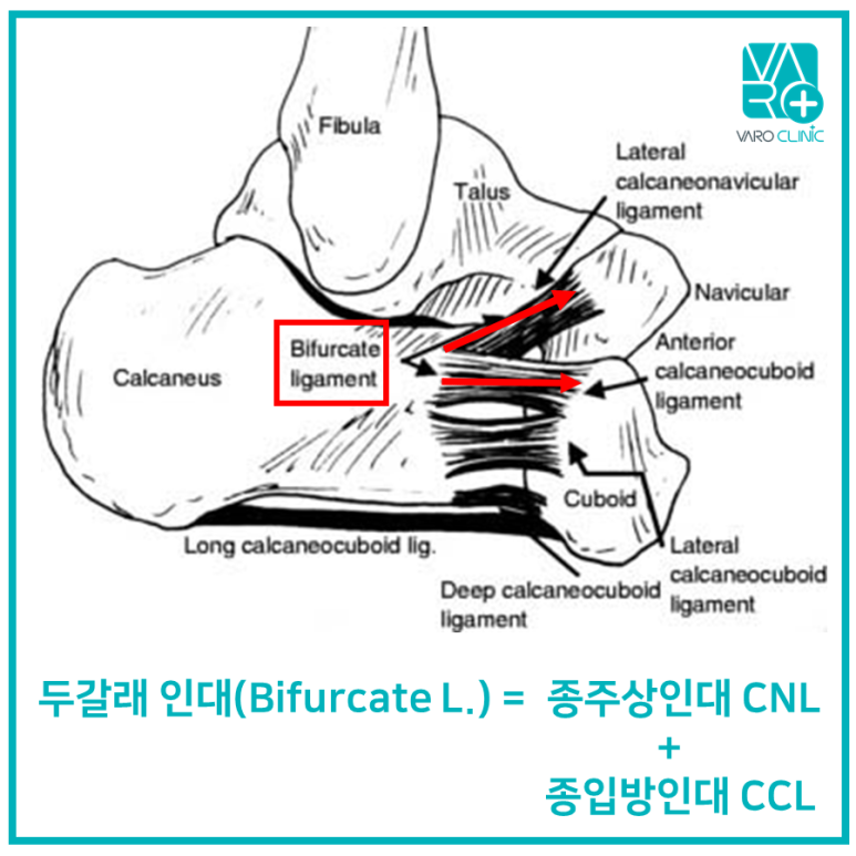 특히 종골의 전방돌기는 두갈래인대(bifurcate ligament)가 늘어나면서 뼈 조각이 떨어지는 견열골절이 흔하게 발생하는 곳입니다.