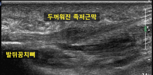 우측 정상 족저근막에 비해좌측 족저근막은 2배 이상 두꺼워져 있습니다.발뒤꿈치뼈 부위에서 발생한 모습이구요.