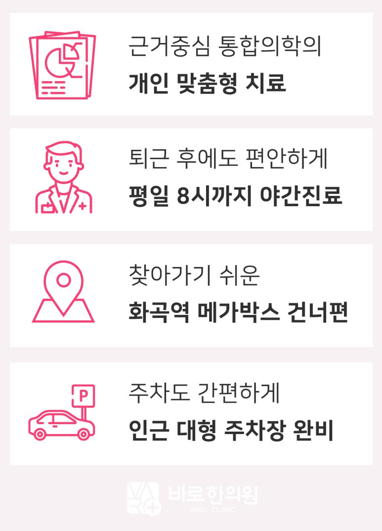 족저근막염은발바닥 아치가 너무 높거나, 낮거나주변 근육의 긴장으로 발생할 수 있기 때문에교정치료를 병행하는 것이효과적입니다.오래된 족저근막염으로고생하고 계시다면,교정치료, 약침, 도침 등한의복합치료를 추천드립니다.족저근막염에치료율이 높은도침에 대한 내용도 한 번확인해보시길 바랍니다.화곡역 바로한의원은매일 저녁 8시까지 진료하고 있습니다.