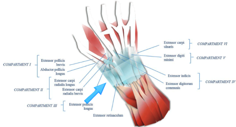 이 힘줄들은 '신전지대(extensor retinaculum)'라는