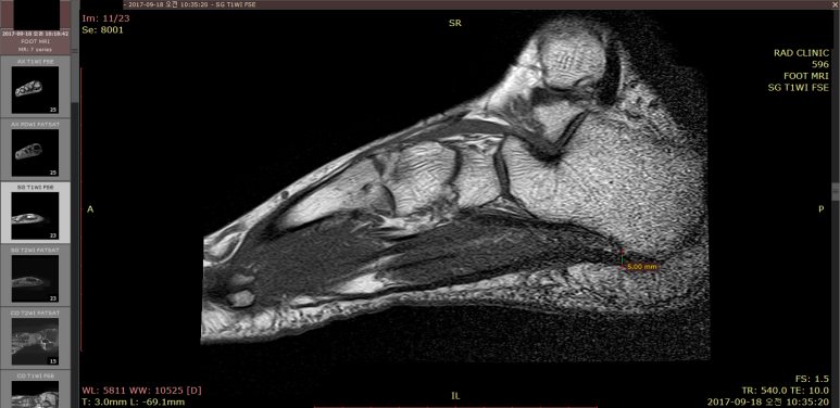 보통 족저근막염 환자들이 5mm 내외 인걸 감안하면 심각한 상태입니다.