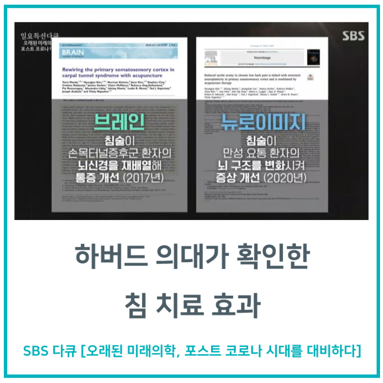 신경통증 영상학 분야의 세계적 석학인 하버드 의대 비탈리 내퍼드 교수는 침 치료가 손목터널증후군, 만성 허리 통증 환자의 뇌 신경을 재배열해서 통증을 호전시킨다고 설명했습니다.