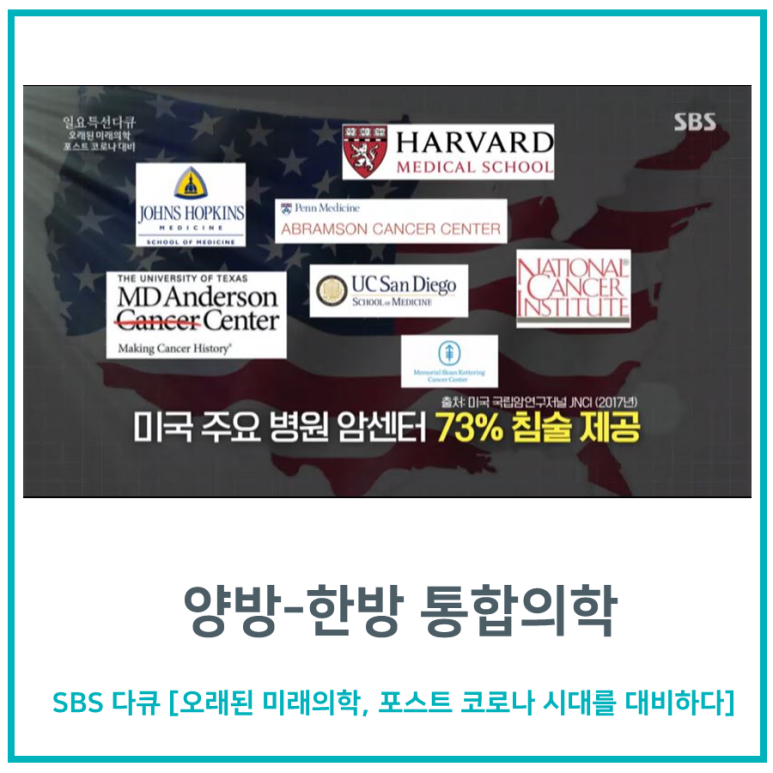 이처럼 침 치료 메커니즘이 규명되고, 특정 질환에 침 치료가 효과적이라는 연구결과가 누적되면서 미국 주요 병원 암센터의 73%는 침 치료를 병행하고 있습니다.