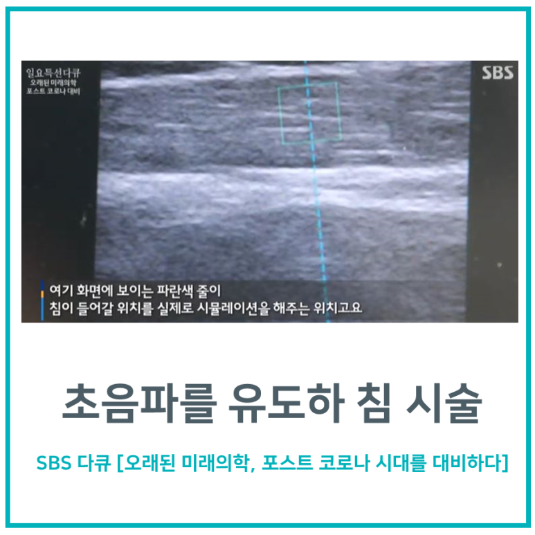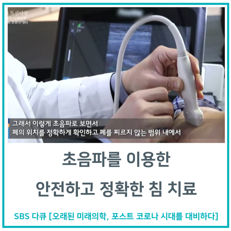 초음파 스캔을 통해 큰 혈관, 신경, 폐의 위치를 확인하여 침이 들어갈 가상의 경로를 정합니다. 초음파 가이드로 침 시술을 하면 실시간으로 침이 들어가는 위치를 눈으로 확인할 수 있습니다.