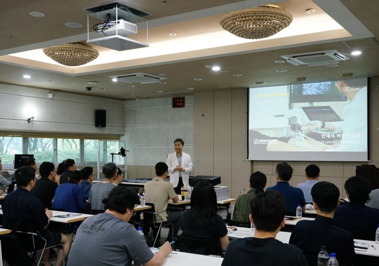 오전 이론 강의에서는 **안태석 교육이사(바로한의원)가 연자로 나서 테니스엘보 환자에서 환인대(annular ligament)의 중요성을 강조했다.