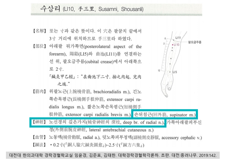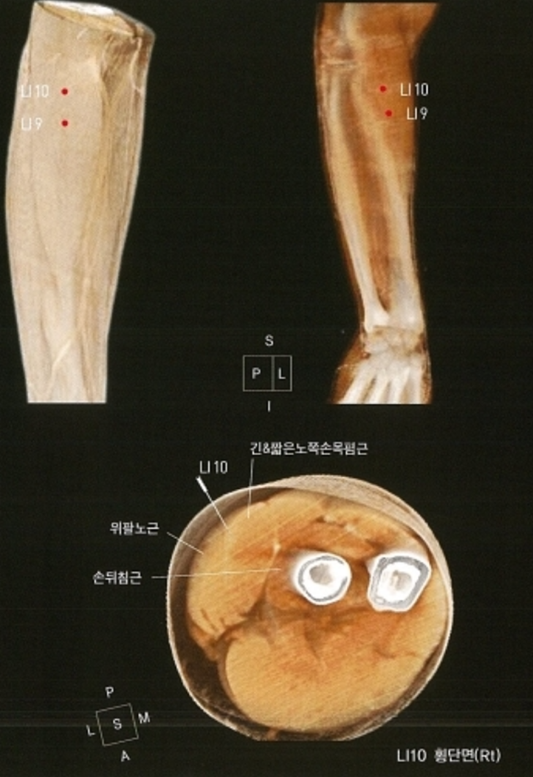 수양명경락의 곡지혈(LI11)과 수삼리혈(LI10)입니다.