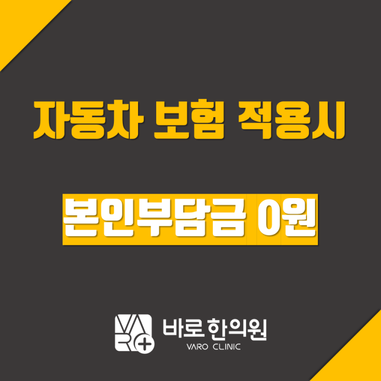 - 자동차보험 적용시기본 치료(물리치료, 침, 부항 등)에약침, 추나, 한약까지본인부담금 없이충분히 치료받을 수 있습니다.