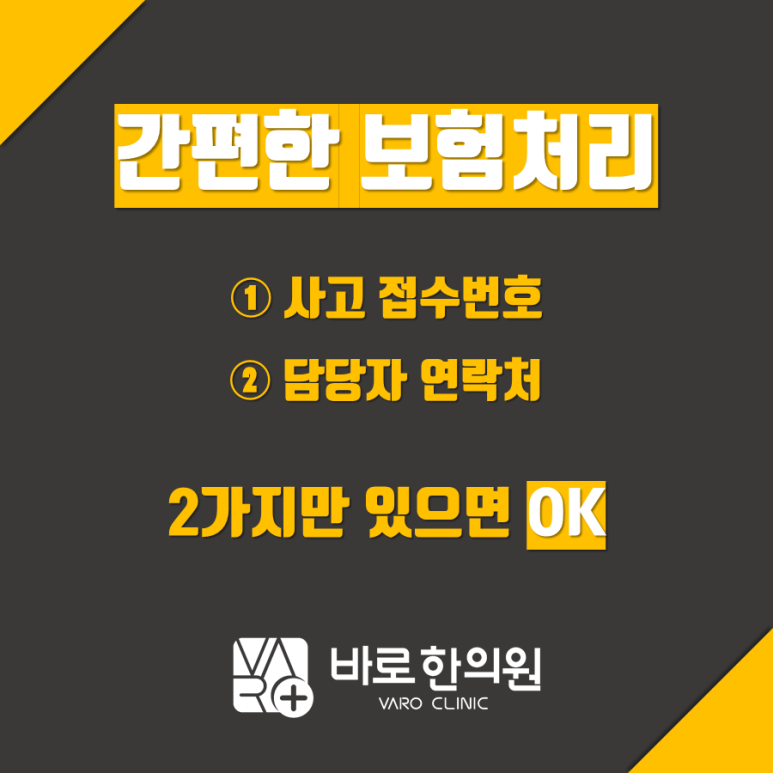 - 보험 처리가처음이신가요?걱정하지 마세요.대인 사고접수 번호와담당자 연락처만 있으면 됩니다.접수 및 보험청구는한의원 원무과에서진행해드립니다.